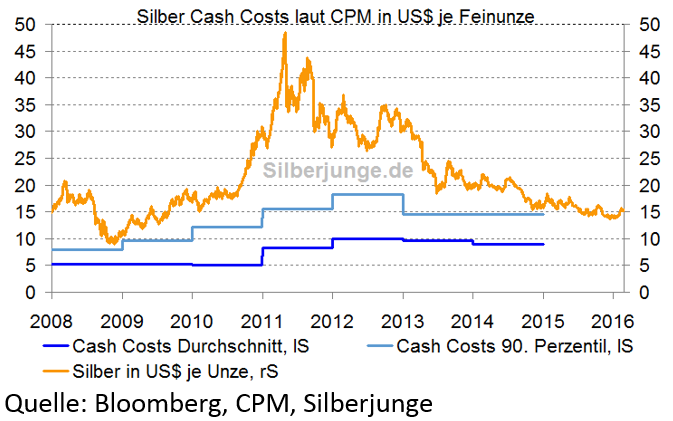 Wir sehen eindrucksvoll anhand der obenstehenden Charts wie die Gewinne der großen Goldproduzenten einbrachen. Selbst ohne Sonderposten wie Sonderabschreibungen sanken die Quartalsgewinne von über 4,2 Milliarden US-Dollar im 3. Quartal 2011 im Umfeld des Goldpreishochs auf -1,7 Milliarden US-Dollar im Schlussquartal 2013 und lagen auch im 3. Quartal 2015 trotz der vorübergehenden Goldpreiserholung bei -57 Millionen US-Dollar. Für das 4. Quartal 2015 liegen noch nicht alle Ergebnisse vor, aber der größte Goldproduzent Barrick Gold kam auf einen Verlust selbst unter Ausklammerung von Sonderabschreibungen und anderen Sonderposten in Höhe von 348 Millionen US-Dollar nach einem Gewinn von 137,5 Millionen US-Dollar im Vorquartal. Ein desaströses Bild ergibt sich im zweiten Chart, wenn wir die außerordentlichen Erträge und Aufwendungen wie Sonderabschreibungen berücksichtigen. Allein im 2. Quartal 2013 betrug der Verlust 18,4 Milliarden US-Dollar. In jedem Quartal des Jahres 2015 fielen Verluste an. Im 3. Quartal 2013 waren es 1,14 Milliarden US-Dollar. Für das Schlussquartal liegen noch nicht alle Daten vor, aber allein Barrick Gold kam auf einen Verlust von 2,6 Milliarden US-Dollar. Unser Fazit lautete daher: Die Goldpreise des 4. Quartals 2015 von unter 1100 US-Dollar je Feinunze reichen den großen Goldproduzenten nicht, um kostendeckend zu arbeiten. Auch wenn ein Rohstoffpreis für eine gewisse Zeit unter die Gewinnungskosten fallen kann, so bietet ein solches Umfeld wie beim Gold im Jahre 2015 hervorragende Chancen. Wären da noch die rückläufigen Neuentdeckungen von GoldHier zeigen wir einmal, dass im folgenden linken Chart 1995 die Neuentdeckungen von Gold im 3-Jahresdurchschnitt ihr Hoch erreichten. In der Ausgabe Januar 2016 des Gloom & Boom & Doom Report von Marc Faber wurde der Chart bis 2013 gezeigt. Hier der Ende 2015 publizierte Chart mit IST-Daten bis 2014: Demnach wird für 2015 ein Hoch der Goldförderung erwartet. Der Hochpunkt der Entdeckungen neuer Goldfunde im Jahre 1995 lässt einen Förderpeak im Jahre 2015 erwarten. Exakte Prognosen verbieten sich, aber der große Trend sollte aufgrund der starken Rückgänge der Neuentdeckungen stimmen. Der Rückgang des Goldgehalts je Tonne geht aus dem zweiten Chart dieses Abschnitts hervor. Auch ohne neue Dollarschwemme, die jedoch nur eine Frage der Zeit ist, stimmt das große Bild also für Gold. Genau zu diesem Thema veröffentlichte die Financial Times im Januar 2016 einen Artikel mit ähnlichem Inhalt. Zitiert wurde der Chef von Barrick Gold, der fallende Goldgehalte und Produktionsniveaus, einen Mangel an Neuentdeckungen und die Verlängerung des Zeitplans bei der Verwirklichung neuer Projekte sieht. Schauen wir uns auch den Verlauf der Investitionen der Goldminen im HUI-Goldminenindex an. Mit Ausnahme von Sibanye Gold sind alle HUI-Mitglieder berücksichtigt. Im 4. Quartal 2012 erreichten die Investitionen mit 6.390 Millionen US-Dollar ihr Hoch und im 3. Quartal 2015 waren sie auf nur noch 2.049 Millionen US-Dollar gesunken. Die Aussagen des Chefs von Barrick decken sich voll und ganz mit unseren Analysen, so dass der Wunsch hier nicht der Vater der Gedanken dieses Vertreters der größten Goldmine ist. Barrick förderte im 3. Quartal 2015 1,663 Millionen Goldunzen. Newmont, die wir aufgrund der Ertragslage vorziehen würden, kam auf 1,34 Millionen Unzen, Anglo Gold Ashanti auf 0,97 und Goldcorp auf 0,92 Millionen Unzen, um einige Flaggschiffe der Branche zu nennen. In unserem Silberbulletin vom 23. Januar 2016 schrieben wir daher treffend: "In Indexpunkten lag der HUI mit 99,19 am 19. Januar 2016 so niedrig wie seit Juli 2002 nicht mehr. Dies liegt daran, dass heute weit mehr Aktien von den Unternehmen herausgegeben sind als damals." Und wir zogen unser Fazit: "Unseres Erachtens sollte die Marke von 90 bis 100 eine starke Unterstützung sein. Wenn der Goldpreis hier dreht, verfügen die Goldminen über eine Hebelwirkung. Denn aus Verlusten werden bei steigenden Goldpreisen schnell Gewinne." Bis zum 27. Februar 2016 konnte der HUI-Goldindex auf 172,71 Punkte zulegen. Sie sehen, dass auch mit Goldminenaktien noch Geld verdient werden kann. Wenden wir uns den Förderkosten für Silber zuWir bilden unten einen Chart ab, der die Cash Costs nach einer Analyse aller primären Silberproduzenten durch das Analysehaus CPM zeigt. Diese beinhalten direkte Förderkosten, Verhüttungs-, Raffinierungs- und Transportkosten, Arbeitskosten, Strom- sowie Energiekosten und sonstige direkte Kosten. Es handelt sich nicht um die sogenannten Total Cash Costs, die auch noch die buchhalterischen Kosten wie z. B. Verwaltungskosten, Abschreibungen auf Maschinen, Förderabgaben, Steuern auf die Produktion enthalten. Kennen Sie den Begriff der Grenzkosten oder auch Marginalkosten? Hier geht es darum, welche Kosten durch die Produktion einer zusätzlichen Mengeneinheit eines Produktes, hier eines Rohstoffes, entstehen. Nun zeigen wir im folgenden Chart neben den Durchschnittskosten das 90. Perzentil der Förderkosten. Was verbirgt sich dahinter? Es gibt an, dass 90 Prozent der Silberförderung mit Kosten unterhalb des 90. Perzentils und 10 Prozent oberhalb stattfinden. Die Rohstoffteams beispielsweise der Deutschen Bank oder der Societe Generale konzentrieren sich auf diesen Wert. Denn nach ihren Untersuchungen ist er ein gutes Hilfsmittel, um zu erkennen, ab wann zumindest mittelfristig Fördereinschränkungen erfolgen können. Dies heißt allerdings nicht, dass ein Rohstoff nicht zeitweilig unter dieses 90. Perzentil fallen kann. Der unten abgebildete Chart zeigt uns wie bereits ausgeführt nur die Cash Costs. Den Chart haben wir auf Basis der jährlichen Untersuchungen des Analysehauses CPM erstellt. Wir sehen, dass der Silberpreis am 28. Oktober 2008 dem 90. Perzentil zwar gefährlich nahe kam, die Marke jedoch nicht (!) unterschritt. Damals hatten wir es allerdings mit einem gewaltigen Deflationsschock, dem Desaster für die Weltwirtsch