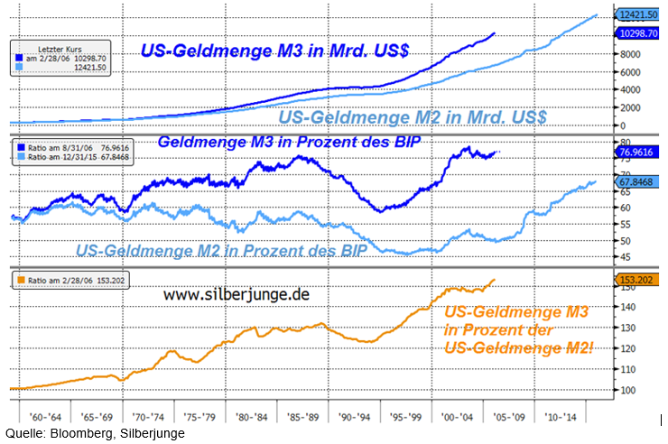 Die US-Geldmenge verschweigt etwas, was Sie wissen sollten..."Es wird niemals so viel gelogen wie vor der Wahl, während des Krieges und nach der Jagd", sagte Otto von Bismarck einmal. Würde er heute leben, hätte er sicher noch das Platzen einer Papiergeldblase hinzugefügt. Aber wir wollen sachlich bleiben! Die Regierungs- und Zentralbankstatistiker müssen das "Zentrum der Wahrheit" auch immer mehr verlassen! Anders ausgedrückt: Zahlen werden frisiert oder erst gar nicht veröffentlicht. Warum nannte Apple jetzt keine Verkaufszahlen für die iWatch? Wären sie gut gewesen, hätte man wohl davon gehört! US-Notenbank stellte die Veröffentlichung der Geldmenge M3 Anfang März 2006 ein!Die US-Geldmenge M3 (dunkelblau) und die US-Geldmenge M2 (hellblau) oben in Milliarden US-Dollar US$, darunter in Prozent des US-Bruttoinlandsprodukts: Die USA stellten die Veröffentlichung der Geldmenge M3 am 6. März 2006 mit einem zuletzt veröffentlichten Wert von 10.344,8 Milliarden US$ ein, angeblich aus Kostengründen und weil keiner auf M3 schaue. Was unterscheidet eigentlich die Geldmenge M2 von der Geldmenge M3? Die heute nur noch zur Verfügung stehende Geldmenge M2 umfasst einzig und allein Sparguthaben und Festgeldkonten bis zu einem Guthaben von 100.000 US-Dollar. Höhere Guthabenbeträge auf diesen Konten werden also in keiner Weise erfasst. Tatsächlich ist die Geldmenge in den USA also wesentlich größer.