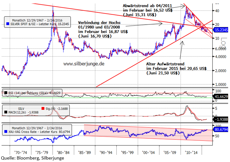 Auch 2011, als vor dem Hintergrund der Nullzinsen in den USA und den großen Konjunkturpaketen Inflationssorgen in den Vordergrund traten, war Silber der Star unter den Edelmetallen. Während der Rohstoffhausse ab Oktober 2001 konnte Silber bis zum Hoch am 25. April 2011 mit +1.082 % stärker zulegen als Gold mit +598 % bis zum Hoch am 6. September 2011. Rohöl kam auf ein Plus von 559,5 % bis zum Hoch am 11. Juli 2008 und Kupfer auf +465 % am 15. Februar 2011. Uns fällt zur Wertentwicklung von Silber in der jüngsten Rohstoffhausse und im Inflationsjahrzehnt der 70er Jahre der Ausspruch von Mark Twain ein: "Geschichte wiederholt sich nicht, aber sie reimt sich". Verbotsgefahr sehr geringEin Silberverbot ist aufgrund der großen Verbreitung in der Realwirtschaft in vielfältigen Anwendungsgebieten kaum zu realisieren. Die geringe Verbreitung in der Bevölkerung lohnt kaum den Aufwand. Ein Goldverbot hingegen ist durchaus denkbar wie oft in der Geschichte gesehen. So war Gold in den USA von Mai 1933 bis Ende 1974 verboten. Dass Silber als Investment ein Schattendasein führt, ist somit sowohl aus antizyklischer Sicht ein Pluspunkt als auch deshalb, weil dadurch eine Verbotsgefahr minimiert wird. Silber seit 1967 im Monatschart Schauen wir uns den Langfristchart des Silberpreises an.Silberpreis in US-Dollar im Monatschart, Relative Stärke Index, darunter der MACD-Indikator und ganz unten das Gold/Silber-Preisratio in Blau: Alles in allem hat Silber einen tollen Zweiklang aufgrund seiner Bedeutung für die Realwirtschaft und seiner Fähigkeit, als Wertaufbewahrungsmittel zu fungieren. Insbesondere bei stark steigenden Goldpreisen wird auch die größere Erschwinglichkeit für breite Massen durchaus für eine Bewusstseinsänderung sorgen können und Silber einen höheren Stellenwert gegenüber Gold verschaffen. Silber wird von der weltweiten Investorengemeinde unterschätzt und erhält derzeit nicht die Beachtung, die es ihm gebührt. Aber wie so vieles ist auch das nicht in Stein gemeißelt. Im Gegenteil, die Chancen stehen gut, dass Silber in den kommenden Jahren einen neuen Siegeszug antreten wird. Seit Mitte 2011 schwächte sich das Wachstum der Weltwirtschaft ab und dies war der Grund, warum seitdem die Rohstoffpreise auf breiter Front stark zurückgingen. Derzeit gibt es keinen Boom der Weltwirtschaft wie 2010/11 und auch keine Inflationssorgen. Daher darbt der Silberpreis derzeit. Aber wie eingetrübt war die Stimmung am Aktienmarkt noch im September 2011? Der Deutsche Aktienindex notierte am 12. September 2011 bei 4.965,8 Punkten. Die Euro-Krise stand im Mittelpunkt und die Anleger machten einen breiten Bogen um Aktien. Heute ist das Umfeld für Silber alles andere als ideal, so wie es im September 2011 für Aktien höchst unvorteilhaft war. Damals war es richtig, Aktien zu kaufen. Aus antizyklischer Sicht sind die Chancen für Silber gerade jetzt groß. Geduld ist jedoch vonnöten. Wenn Sie sie besitzen, wissen Sie, was zu tun ist. Warum Aktien bei Inflation nicht halten, was sie laut Bankberater versprechen, zeigen wir Ihnen in unserer Wissensdatenbank. Was für Gold spricht, die Vorzüge von Silber gegenüber Gold, die Gefahren für die Besitzer von Bankeinlagen, die Bedrohung des Dollarimperiums, wieso der Euro zur italienischen Lira verkommt und Informationen über das richtige Timing bei Gold- und Silberkäufen erfahren Sie in unserer Wissensdatenbank. Natürlich erhalten Sie als Abonnent unserer Publikationen noch viel mehr.